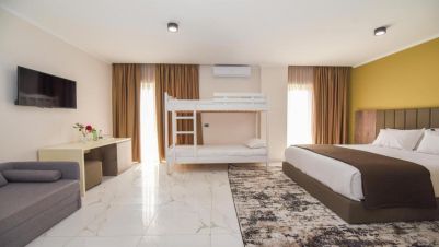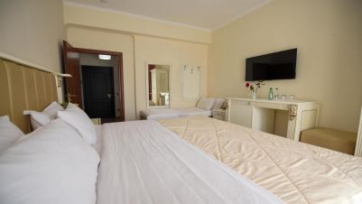 Фамилна или четворна стая: Този вид стаи разполагат с 1 двойно легло и 2 единични легла. Подходящи са за семейства, стаите са просторни. Разполагаме с 8 четворни стаи, като 6 от тях са с изглед към морето. Стаите разполагат с: