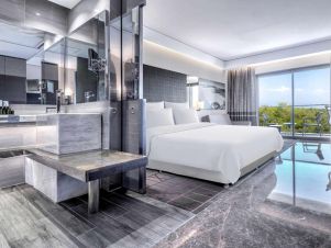 Deluxe Suite: 73 м2, 1 спалня с 1 хол, разделени с пеходна врата, мини бар, огледална телевизия, интернет, директна телефонна линия, централен климатик, сейф, балкон, сешоар, сет за чай и кафе.
