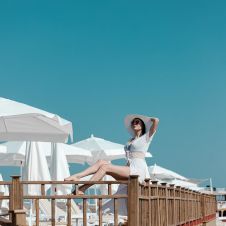 Собствен, пясъчен с дължина 120 м., удостоен със сертификат "Син флаг" и платформа (2040 кв.м). Шезлонги, чадъри, матраци на плажа и при басейна - безплатно. Плажни кърпи – безплатно.