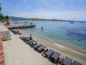 Собствен, пясъчно - чакълест. Чадъри, шезлонги и плажни кърпи на плажа и при басейна – безплатно.